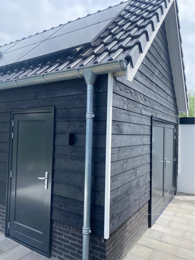 - Voorzien van licht en elektra: De schuur is volledig uitgerust met verlichting en elektrische voorzieningen, waardoor het geschikt is voor allerlei activiteiten, zowel overdag als ’s avonds.