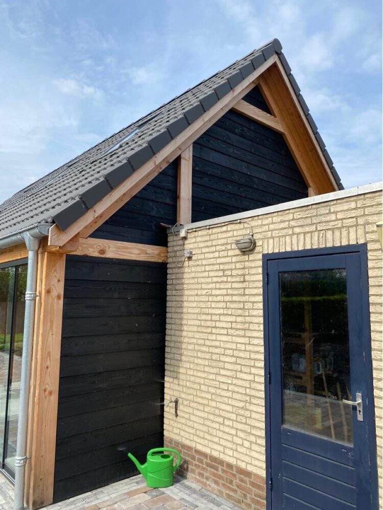 - Afmetingen: De schuur heeft royale afmetingen met een lengte van 11,2 meter en een breedte van 6,4 meter. De wandhoogte is circa 2,4 meter en de nokhoogte bedraagt 5,4 meter, wat zorgt voor een ruimtelijk gevoel. Het zadeldak heeft een hellingshoek van 45 graden, wat bijdraagt aan de klassieke uitstraling en optimale waterafvoer.